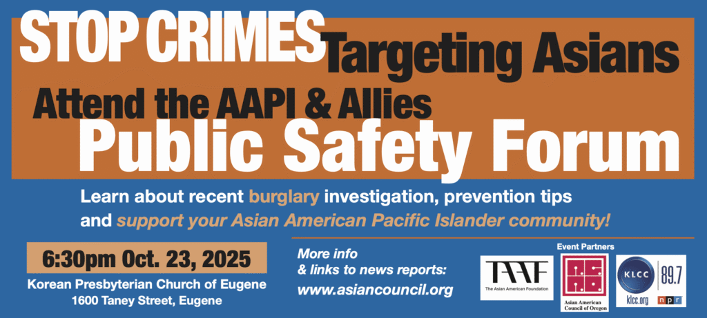 In response to growing public concern, the Asian American Council of Oregon will host an Asian American and Pacific Islander (AAPI) Public Safety Forum at 6:30 p.m. on Thursday, October 23, at the Korean Presbyterian Church (1600 Taney St.) in Eugene.